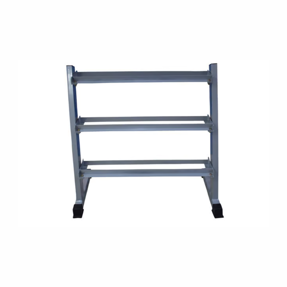 - 3-tier horizontal dumbbell rack made of heavy-gauge steel.