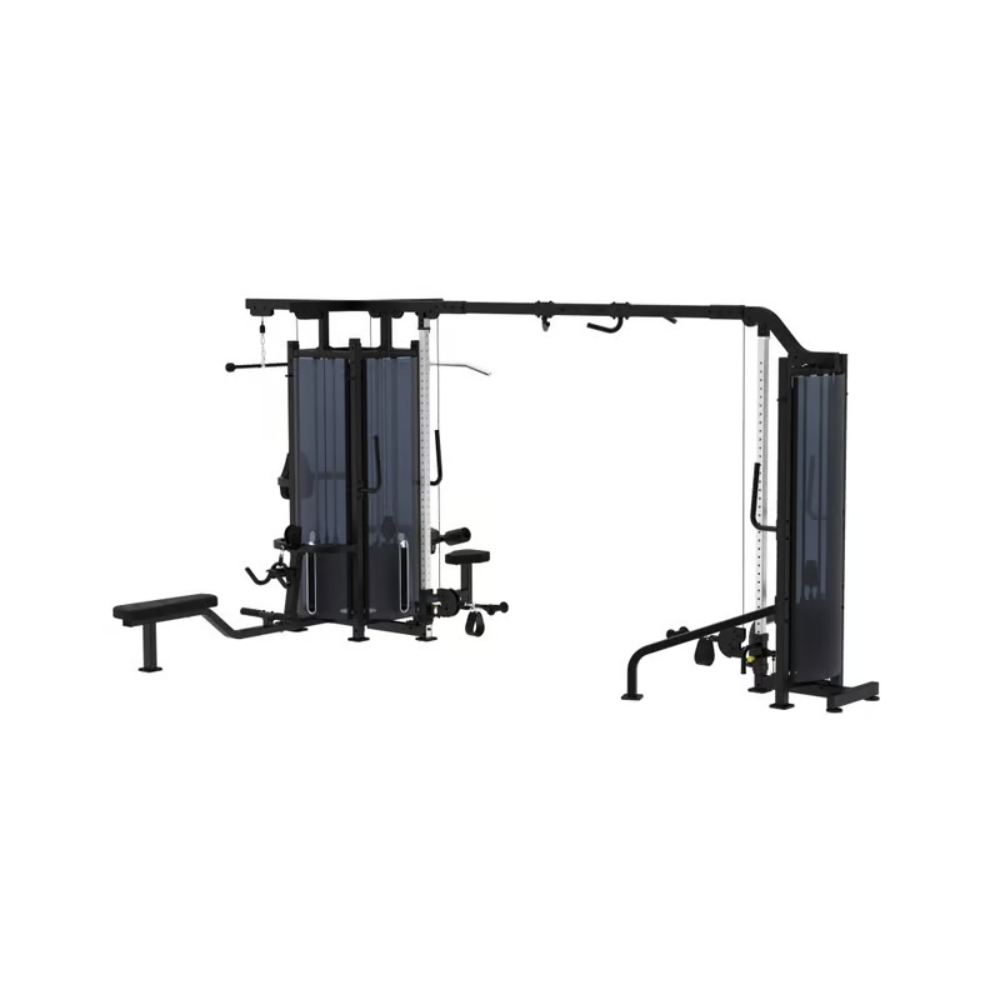 The five-station multistation allows you to perform a variety of exercises, including lat pull down, pulley, triceps, hi/low pulley, cable cross/cable crossover.