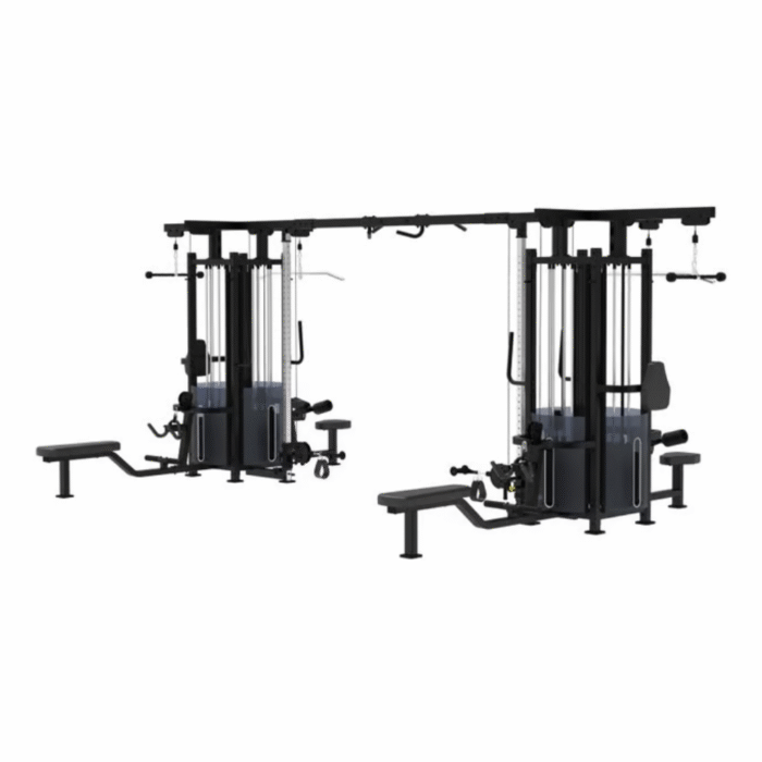The eight-station multistation allows you to perform a variety of exercises, including double lat pull down, double pulley, double triceps, double hi/low pulley, cable crossover.