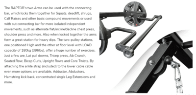 With weight LOAD capacities for Pressing/Squatting Arms 250kg (550lbs) and cable/pulley 180kg (396lbs) RAPTOR leverage gym is equally effective for the ‘beginner’ as it is for the ‘advanced’ Sports Pro. Fitted with adjustable Safety limiters offers peace of mind and a safe environment when attempting your ‘MAX’. You will NOT out grow the BRUTEforce® RAPTOR leverage gym.