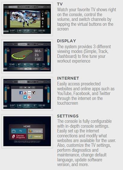 TV | Watch your favorite TV shows right on the console, control the volume, and switch channels by tapping the virtual buttons on the screen The system provides 3 different viewing modes (Simple, Track, Dashboard) to fine tune your workout experience. |